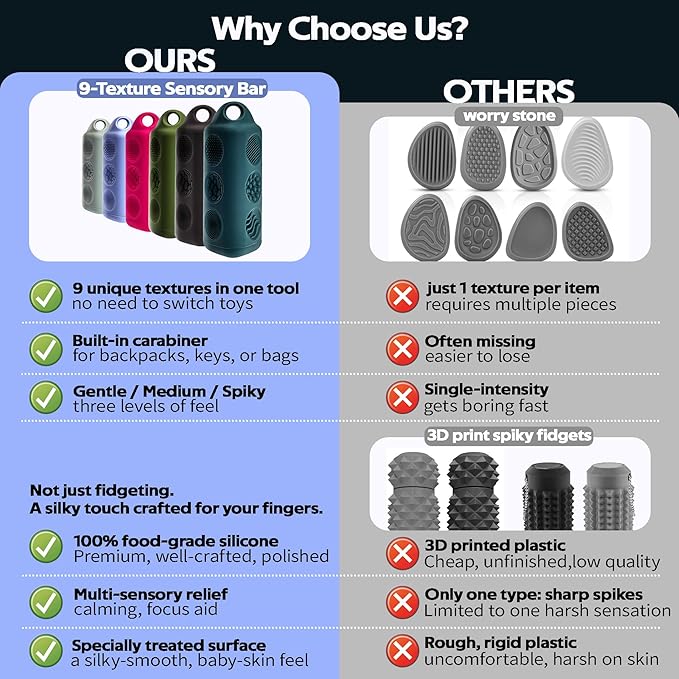 - 9 Textures, One Tool Discover calming relief in your hands. This single bar includes nine uniquely textured zones to help calm nerves, improve focus, and satisfy restless fingers.