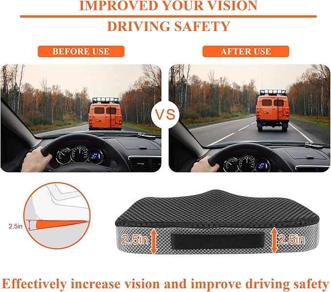 - Expand Driving Vision - The height of the driving position is increased by 2.5 inches, and apparently by using our car seat cushions for driving could expand the vision and help the driver see more clearly. The car seat cushions for short people could also promote right posture and correct spinal alignment for a good driving. We also add a non-slip bottom to keep the car seat pad in place