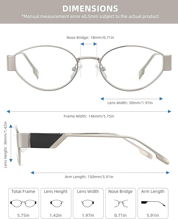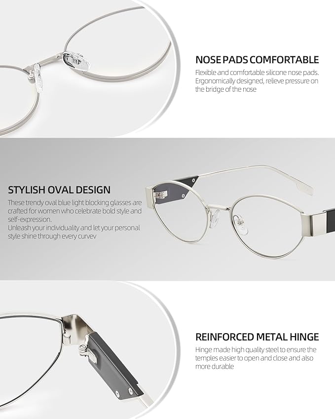 - [COMFORTABLE TO WEAR] - These trendy oval blue light glasses are made of solid metal frames, UV400 Polycarbonate lenses, strong metal hinges and skin-friendly silicone nose pads. Suitable for all kinds of daily wear
