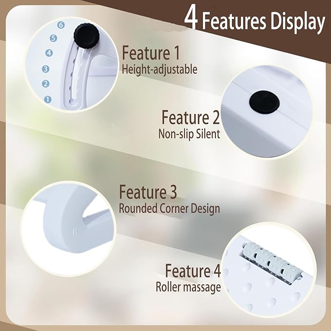 - 【Strong Practicality】: The Footstool Has 6 Different Heights, Which Can Be Adjusted, And is Also Equipped With A Large Area of Small Particle Massage Surface And 5 Large Massage Rollers, When Working, Put Your Feet On it And Roll The Wheels. it Not Only Massages The Soles of The Feet, But Also Promotes Blood Circulation And Completely Relaxes The Legs.