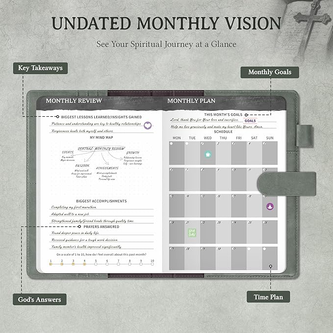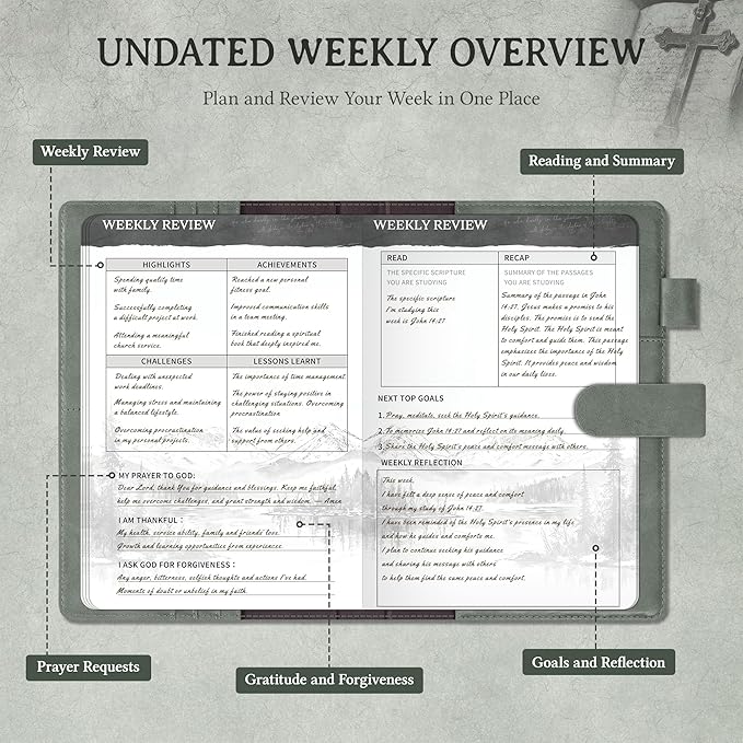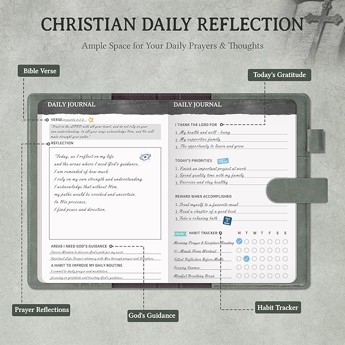 - 【Guided Spiritual Journal】Features structured daily, weekly, and monthly sections for devotionals, gratitude, goal-setting, blessings/answered prayers, scripture reflection, and prayer tracking. The ample writing space helps you dive deeper into your faith, while the habit tracking feature helps keep you accountable and organized.