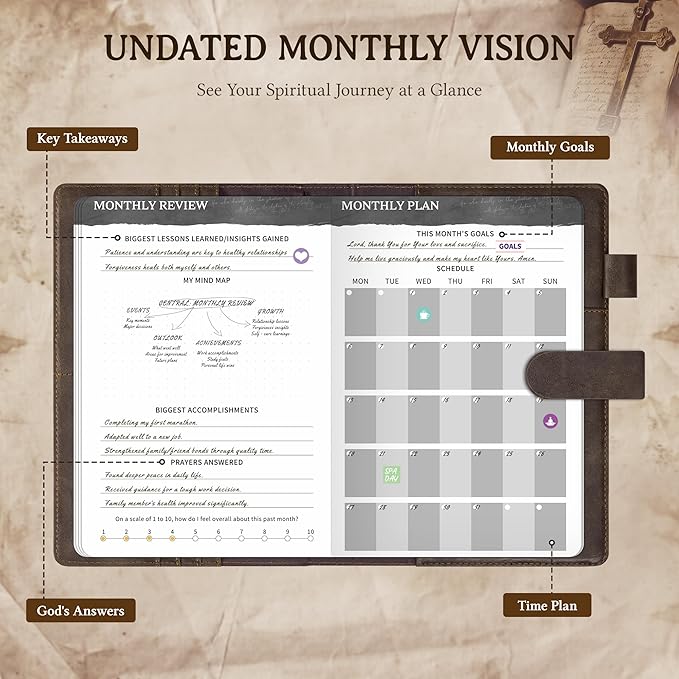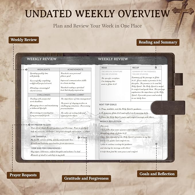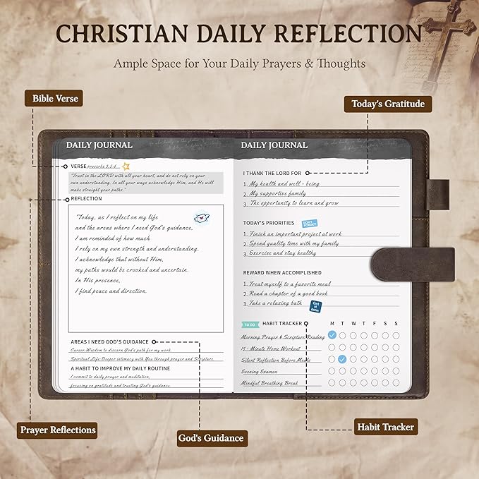 - 【Guided Spiritual Journal】Features structured daily, weekly, and monthly sections for devotionals, gratitude, goal-setting, blessings/answered prayers, scripture reflection, and prayer tracking. The ample writing space helps you dive deeper into your faith, while the habit tracking feature helps keep you accountable and organized.