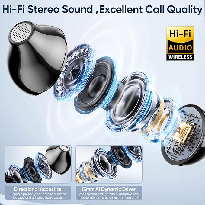 - [Immersive Sound, Clear Calls]: The wireless headphones are equipped with a 13mm dual magnetic driver unit, bringing vibrant high-fidelity stereo sound and excellent call quality. The use of advanced dual-sonic directional audio technology can effectively eliminate sound leakage while dynamically compensating for bass clarity, allowing you to easily enjoy music and clearly answer calls even in a noisy environment.