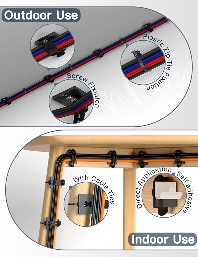 - 【35 Pcs Wire Clamps For Cables】This cable management kit contains 10 adhesive cable clips, 5 replacement silicone cable clips, 10 cable ties, and 10 small screws, providing a complete set of accessories suitable for cable management in offices, under desks, behind TVs, on walls, and for hanging holiday decorations