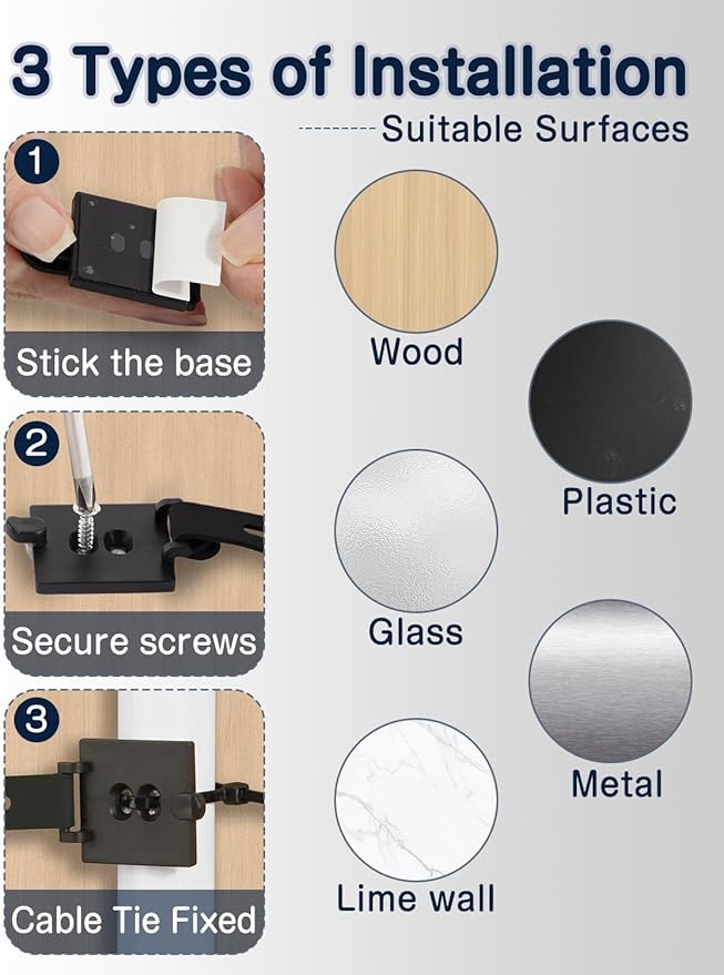 - 【Flexible Installation】This adhesive wire clip offers three convenient installation methods. Its smooth, flat surface allows for direct adhesion to the bottom of the adhesive backing. For long-term, secure fastening, screws can be used. For uneven surfaces, installation can be achieved by securing with cable ties. With these adhesive wire clips, you can easily organize messy cables in your home, office, and car, making every space neat and attractive