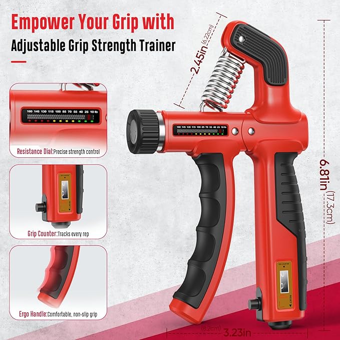 - 𝗔𝗱𝗷𝘂𝘀𝘁𝗮𝗯𝗹𝗲 𝗥𝗲𝘀𝗶𝘀𝘁𝗮𝗻𝗰𝗲 𝘄𝗶𝘁𝗵 𝗥𝗲𝗮𝗹-𝗧𝗶𝗺𝗲 𝗧𝗿𝗮𝗰𝗸𝗶𝗻𝗴 – Customize your training with a 10-160 lbs resistance dial and monitor your progress using the built-in force gauge. Fine-tune your grip strength with precision and challenge yourself at every level.
