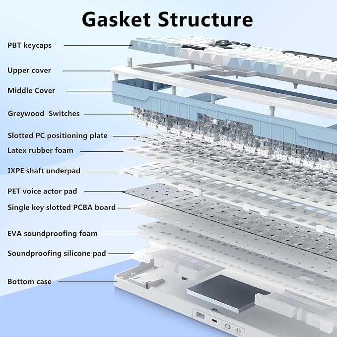 - 【Gasket Structure and PCB Single Key Slotting】 This computer keyboard features a gasket structure, extended integrated silicone pad, and PCB single key slotting, better optimizes resilience and stability, making the hand feel softer and more elastic. Five layers of filling silencer fills the gap between the PCB, the positioning plate and the shaft,effectively counteracting the cavity noise sound of the shaft hitting the positioning plate, and providing a solid feel