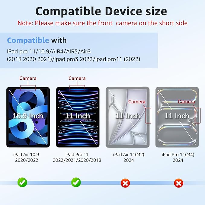 - Precise compatibility Specifically compatible with the iPad Air 5/4 10.9-inch, iPad Pro 11-inch (2022/2021/2020/2018 models) (not compatible with the iPad Pro 11-inch 2024 model). Compatible iPad models: A2435 A2761 A2762 A2588 A2589 A2591 A2301 A2459 A2460 A2377 A2228 A2068 A2230 A2231 A1979 A1980 A2013 A1934 A2324 A2072 A2316 A2325 A2759. Excludes all other iPad models to ensure perfect alignment with screen cutouts and curved design.