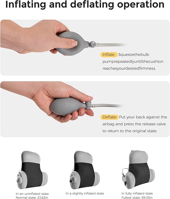 - Innovative airbag design provides personalized support: This lumbar pillow adopts ergonomic design, fits the natural lumbar curvature, and the thickness of the airbag is adjustable. The thickness of the filled state is 5.9in, and the thickness of the normal state is 2.36in When inflated, the back support pillow offers enhanced firmness support. In contrast, deflated or adjusted to a thinner setting, it provides softer, more flexible support. This design is ideal for different comfort preferences and allows for personalized relief