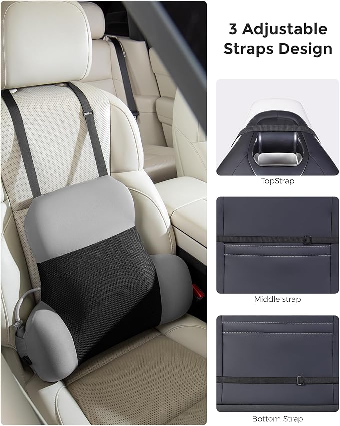 BEBAS Lumbar Support Pillow for Office Chair & Car Seat - Memory Foam Back Cushion with Adjustable Air Cushion, Dual Strap System for Back Pain Relief (Fits Gaming/Home Chairs)