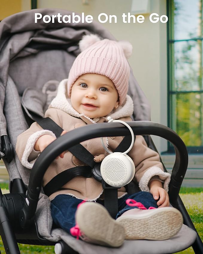 - DESIGNED FOR PORTABILITY: Weighing just 0.42 lbs (190g), this ultra-lightweight portable white noise machine is ideal for families on the go. It fits easily into a bag, making it perfect for travel, whether you're heading on a family vacation. The compact size, along with a silicone strap that allows for easy hanging, means you can position it wherever needed—whether next to your baby's crib or on the stroller. With a long-lasting 1000mAh battery, you can enjoy up to 12 hours of continuous use on a single charge, even at maximum volume and brightness. Plus, it comes with a small storage pouch to keep everything neat and organized.