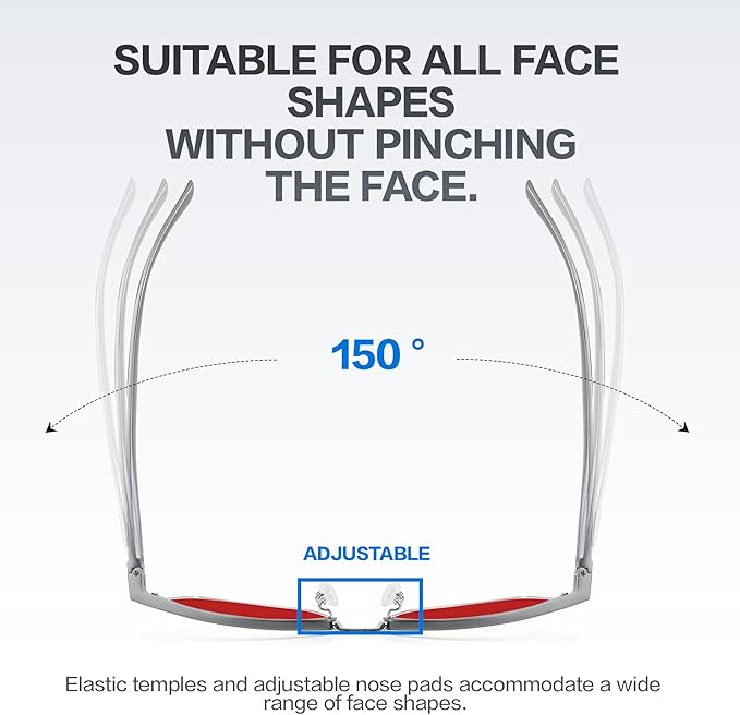 • Engineered for All-Day Comfort: Designed with ergonomics in mind, these blue light-blocking glasses evenly distribute frame pressure to minimize stress on your nose bridge and ears. The lightweight Al-Mg frame, paired with soft silicone nose pads, conforms naturally to your face for a custom, comfortable fit. Flexible spring hinges allow the temples to adapt to a wider range of face shapes, ensuring a secure yet gentle hold.