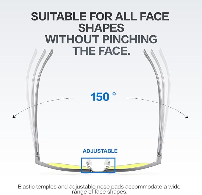 • Engineered for All-Day Comfort: Designed with ergonomics in mind, these blue light-blocking glasses evenly distribute frame pressure to minimize stress on your nose bridge and ears. The lightweight Al-Mg frame, paired with soft silicone nose pads, conforms naturally to your face for a custom, comfortable fit. Flexible spring hinges allow the temples to adapt to a wider range of face shapes, ensuring a secure yet gentle hold.
