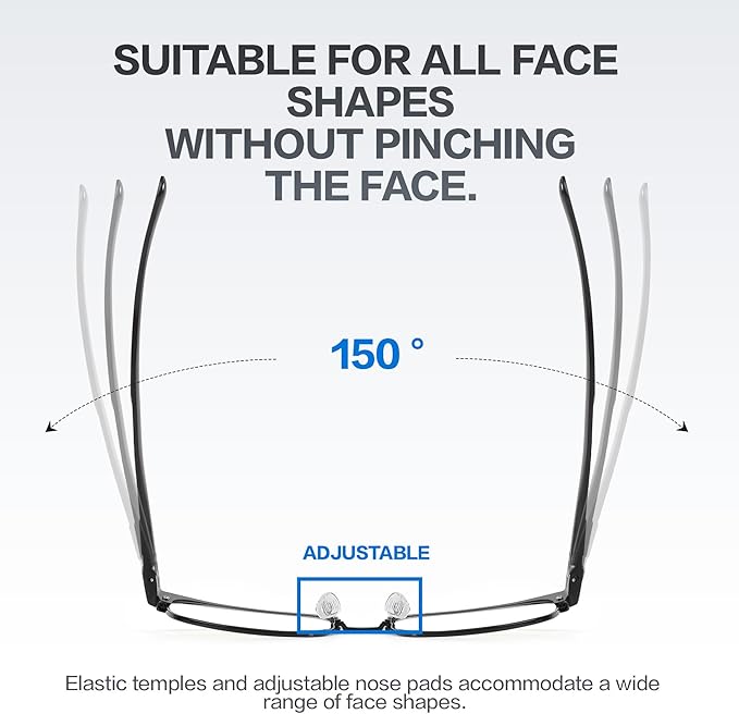 - Engineered for All-Day Comfort: Designed with ergonomics in mind, these blue light-blocking glasses evenly distribute frame pressure to minimize stress on your nose bridge and ears. The lightweight Al-Mg frame, paired with soft silicone nose pads, conforms naturally to your face for a custom, comfortable fit. Flexible spring hinges allow the temples to adapt to a wider range of face shapes, ensuring a secure yet gentle hold.