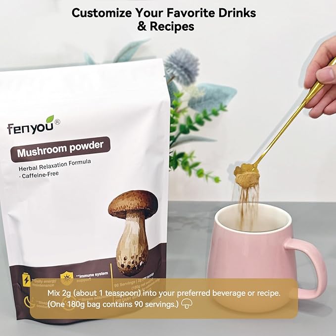 - 【Convenient Mushroom Powder for Daily Use】Each 180g package provides 90 servings (2g each). The included measuring spoon ensures accurate dosing. Easily blends into Mushroom coffee, tea, smoothies or your favorite beverages.