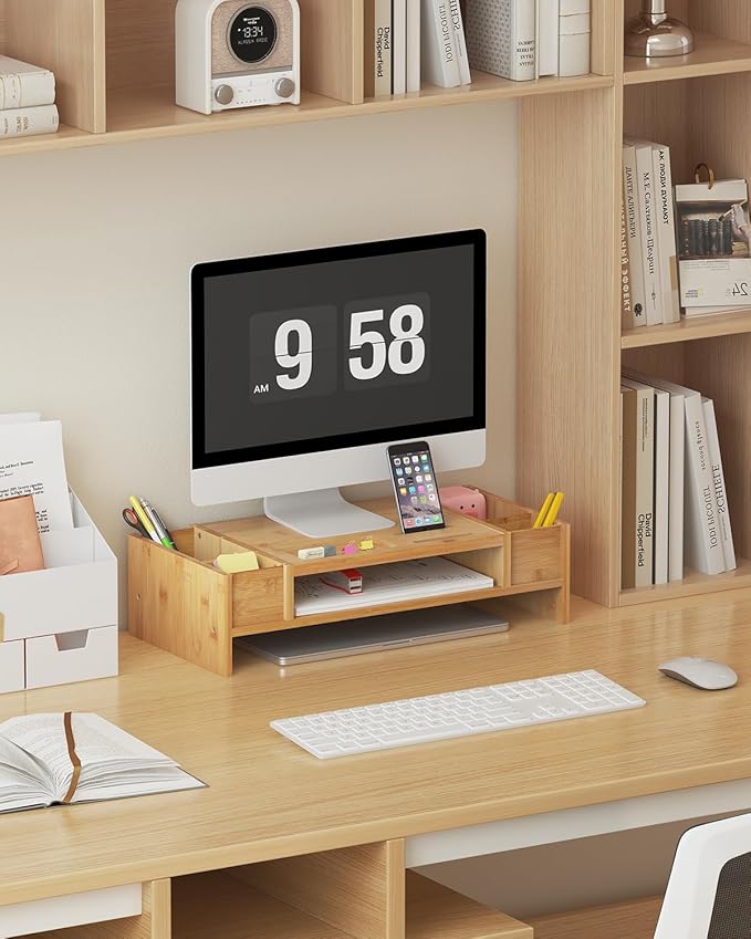 - SMALL SPACE ORGANIZER: Simply slide the keyboard underneath to save space, this monitor stand offers ample storage with side compartments for common office utensils (pen, highlighter,scissors, stapler), a middle shelf for files and notebooks, plus storage slots for your phone, sticky notes and clips