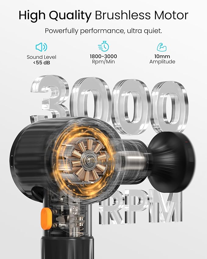 - 【Powerful Performance & Ultra-Quiet Design】The percussion massage gun is equipped with a high-quality brushless motor that delivers powerful percussion (1800–3000 RPM variable speeds, 10mm amplitude), with noise below 55dB (as quiet as a library). Enjoy deep, peaceful therapy at home, the gym, or the office without worrying about disturbing others.