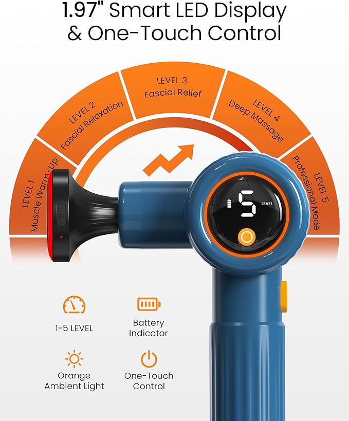 - 【Smart LED Display & One-Touch Control】The Napre massager gun is equipped with a 1.97-inch smart LED display that shows real-time speed and battery level. This muscle massager offers simple one-touch operation for turning on/off and adjusting its 5 speed levels.