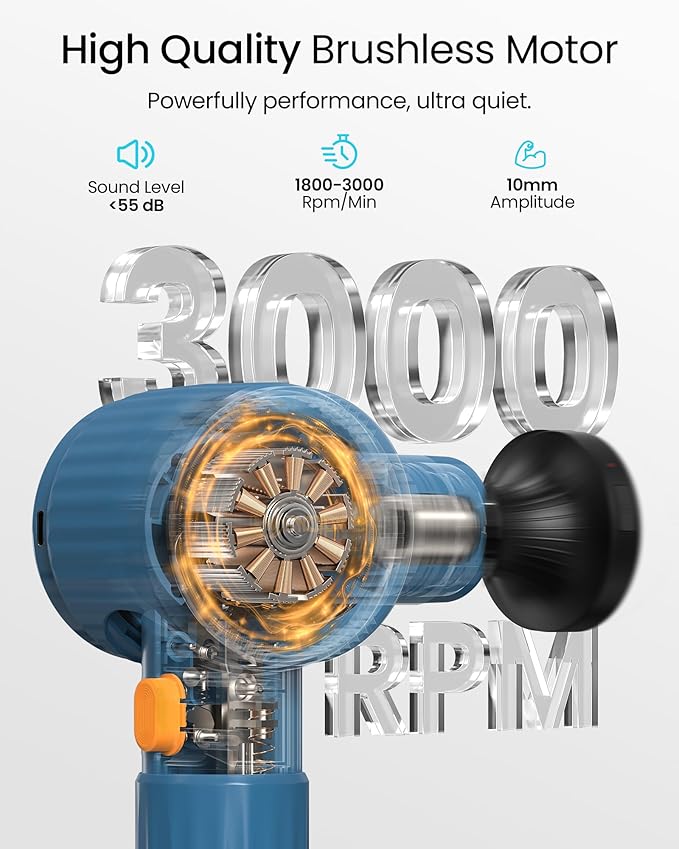 - 【Powerful Performance & Ultra-Quiet Design】The percussion massage gun is equipped with a high-quality brushless motor that delivers powerful percussion (1800–3000 RPM variable speeds, 10mm amplitude), with noise below 55dB (as quiet as a library). Enjoy deep, peaceful therapy at home, the gym, or the office without worrying about disturbing others.