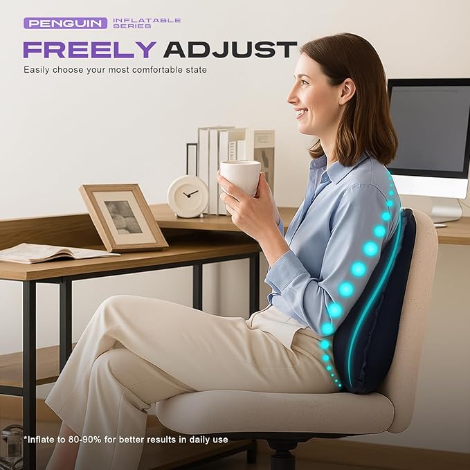 - Press-to-Inflate Design – No Pump Needed. Easily inflate this lumbar support pillow by simply pressing with your hand—no air pump required. Perfect for quick use during airplane travel, long car rides, or when sitting at your office desk.