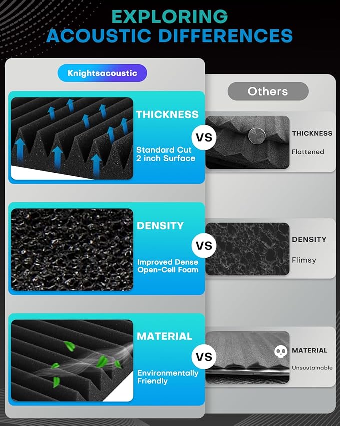 - PROFESSIONAL SOUND ABSORBING PROPERTIES – Our acoustic foam panels are expertly designed to reduce noise pollution by absorbing sound rather than blocking it. They minimize echoes and unwanted background noise, creating a cleaner, more focused audio environment. Unlike soundproofing, acoustic foam specifically manages reverberation, making it ideal for studios, recording booths, control rooms, and radio stations. Use our foam to eliminate standing waves and flutter in spaces of any size, ensuring professional-grade sound quality for your projects.