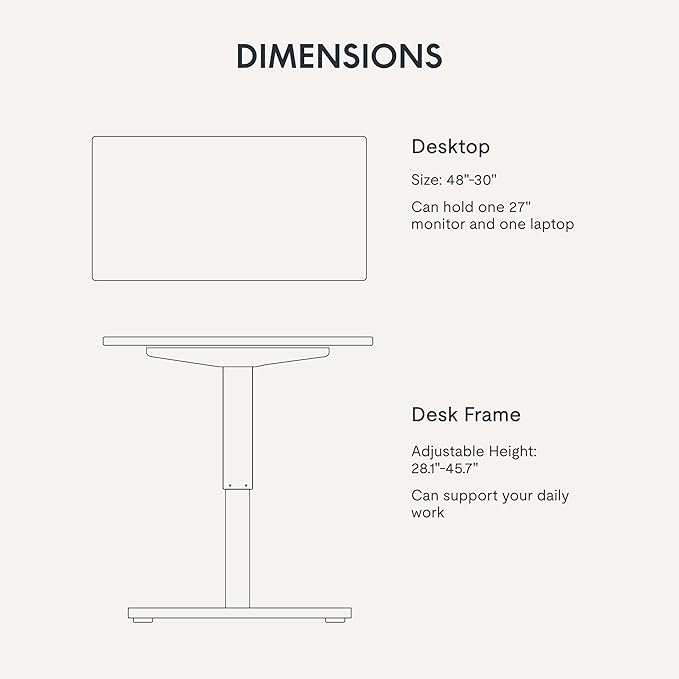 - SMOOTH ELECTRIC HEIGHT ADJUSTMENT: Say goodbye to manual height adjustments. This desk is equipped with an electric lift system that allows you to easily adjust the desk's height from 28.1" to 45.7"(without 1" thickness of table top included). Even better, the motor operates quietly with noise levels below 50 dB, ensuring a peaceful working environment.