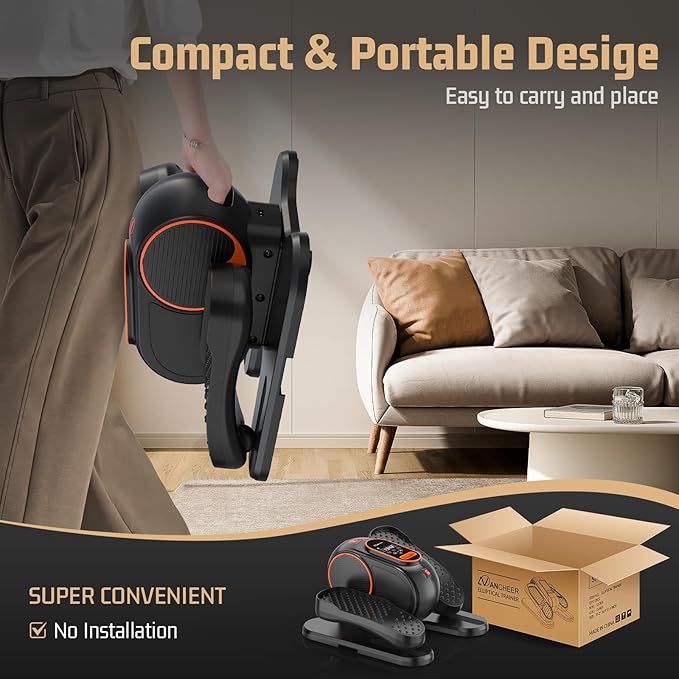 - 【Whisper-Quiet & Portable】Designed with silent rollers and advanced technology, this compact elliptical ensures a smooth and ultra-quiet operation even at high speeds—ideal for use at home or in the office without disturbing others. Its lightweight and portable design allows you to exercise anytime, anywhere.