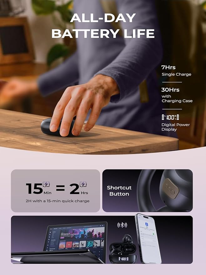 - 【30H of Listening Time & IPX6 Waterproof】Get up to 2 hours of playback with just 10 minutes of charging. Combined with the charging case, the total playback time reaches 30 hours, keeping you energized all day long. The EP10 clip on earbuds features a protective nano-coating, offering IPX6 water resistance, so you don’t have to worry about sweat or rain interference. Let these open ear headphones be your perfect sports companion for any outdoor activity