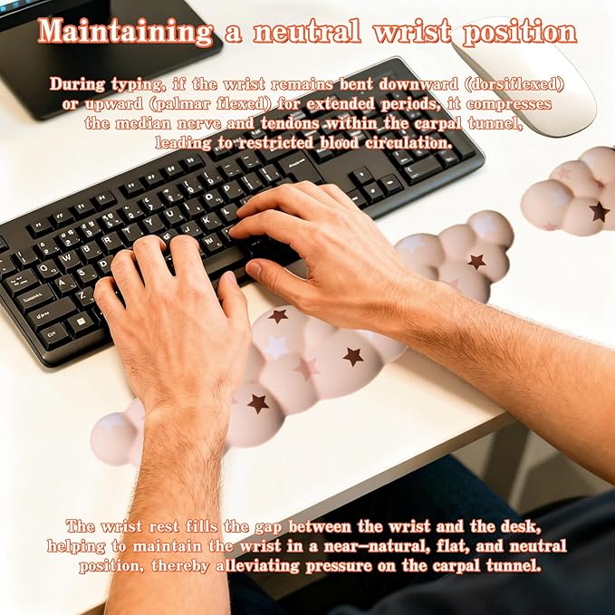 - Core features:Wrist rests support the wrists during extended computer use, reducing fatigue and discomfort. They maintain a natural wrist posture, minimizing suspended time and enhancing comfort while working or typing. Ideal for those who spend long hours at the computer.